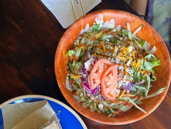 とても大きなボウルには、ライスが隠れてしまうほどの野菜やお肉のようでお肉じゃないベジミート、ヴィーガンチーズ、自家製ドレッシングがたっぷり。下にはパープルライスが入っています。野菜がこんなに入ったタコライスが食べられるのははここだけかも?