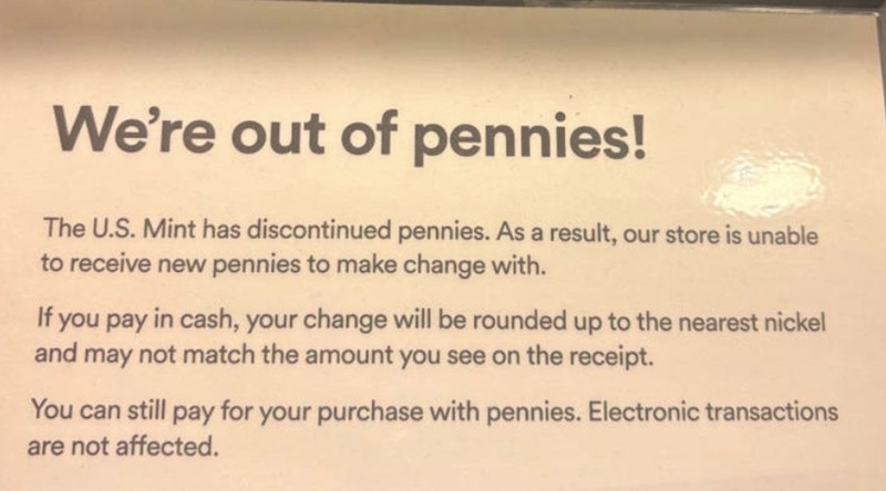 レジのところに、こんな張り紙がしてある場合があります。(ペニーが足りないのでお釣りは5セント単位になるよ)