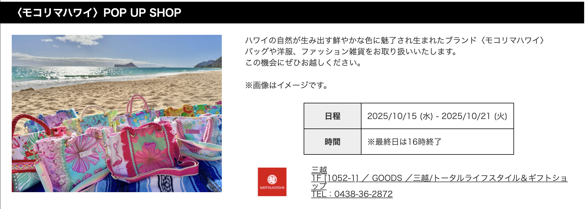ハワイ好きの皆さんに朗報です!2025年10月15日(水)から21日(火)まで、イオンモール木更津にて〈モコリマハワイ〉のPOP UP SHOPが期間限定でオープンしています。
