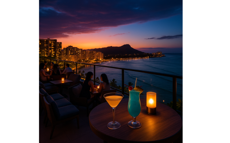 ハワイでの夜遊びスポットといえば、外せないのがルーフトップバーです。なかでも注目度が高いのが、ワイキキの中心部にある「SKY WAIKIKI」。観光客にも人気のこの場所は、お酒・夜景・音楽が三拍子そろった王道ナイトスポットです。