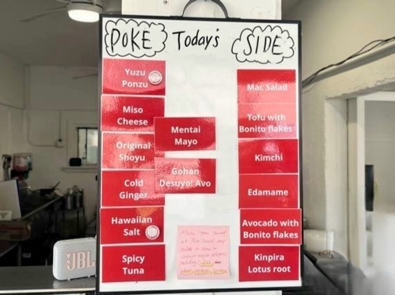 レジ横に本日のポケとサイドのメニューがあるので、この中から好きなものを1~2種類選びましょう。ポケのフレーバーはどれも私たち日本人に馴染みのあるものばかりで、中にはご飯ですよ!を使用したものや柚子、明太子などといったものも。