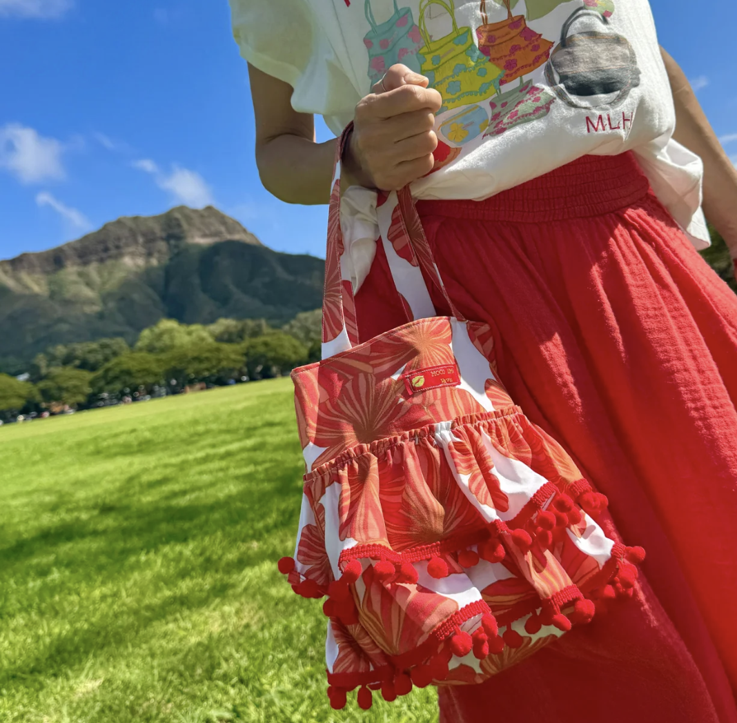 これらの魅力が詰まった巾着バッグは、持つだけでコーディネートの主役になってくれます。シンプルなTシャツとデニムの組み合わせも、このバッグを合わせるだけで一気にハワイらしい華やかなスタイルに。荷物が少ないからこそ、バッグそのものの可愛らしさがより引き立つのです。