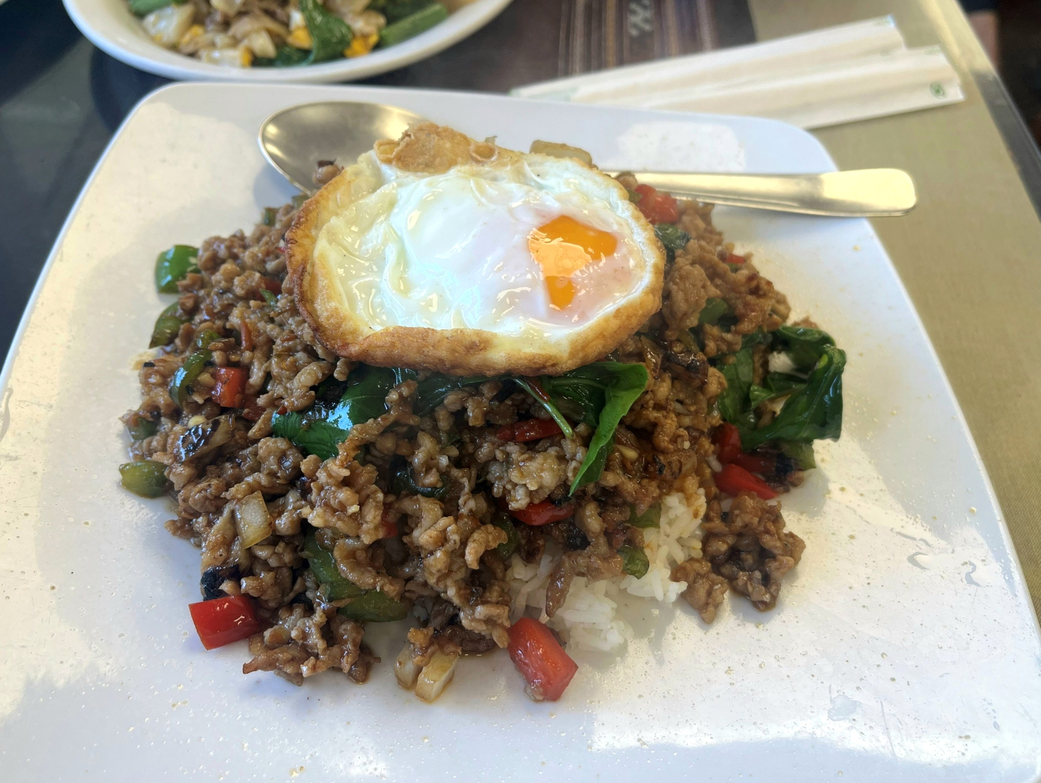 お店のスペシャルメニューのひとつで、私も大好きなキング・オブ・チリ。ジャスミンライスの上にはたっぷりのひき肉、そこに目玉焼をオンしたタイ風ロコモコといった感じの料理です。
