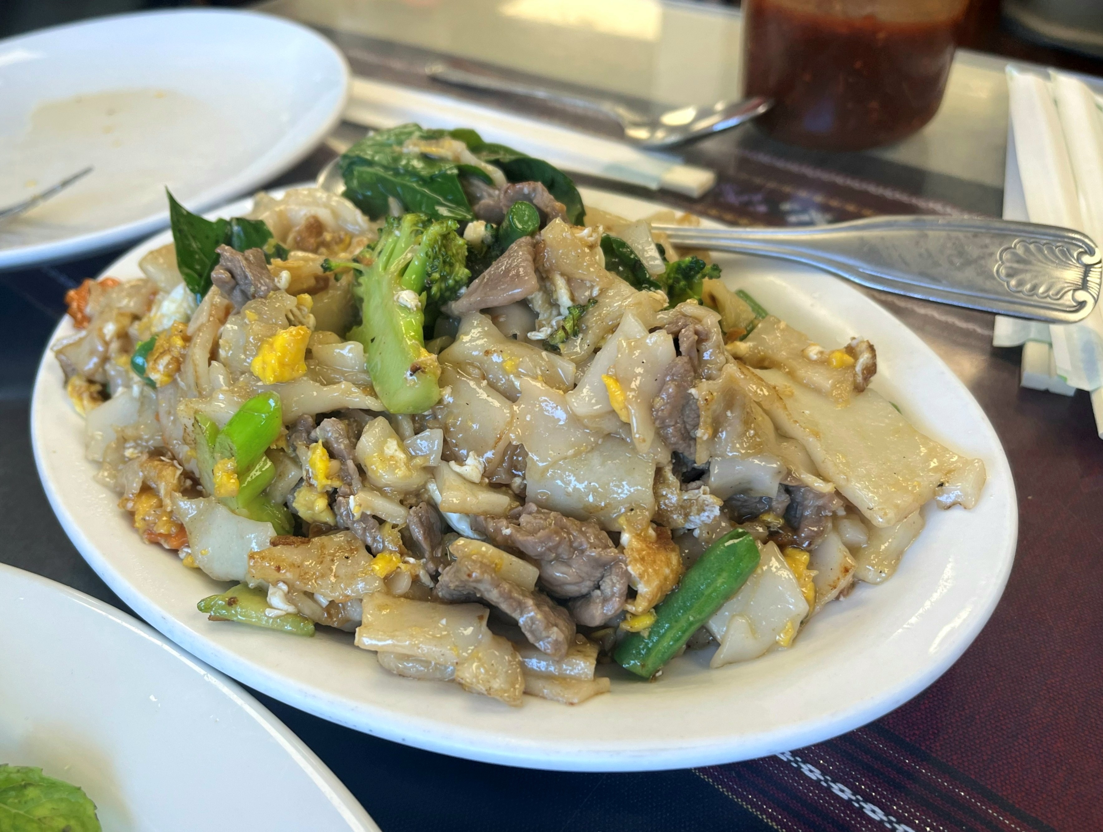 我が家は細麺よりも太麺派で、だいたいどこでもキー・マオ(Drunken noodle)を頼むのですが、ここの麺は太くてもちもち。ガーリックがきいたソースに野菜やお肉がたっぷり入っており、食べ応えも十分!