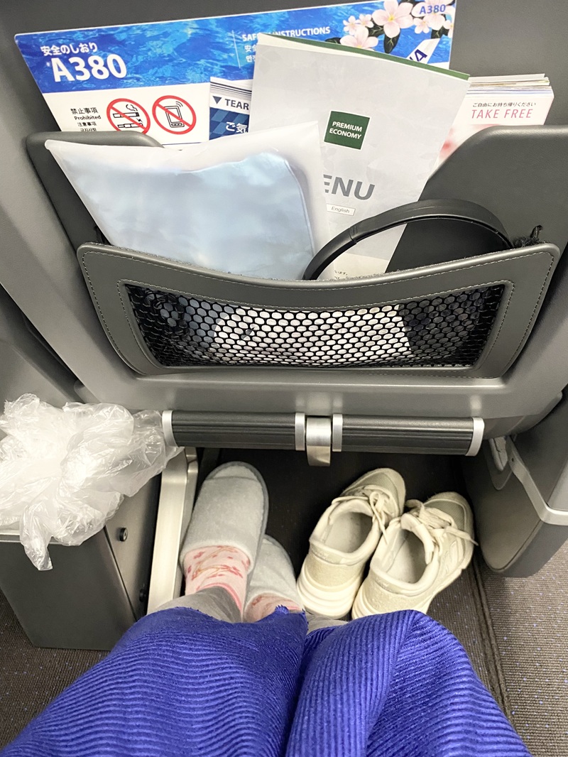 日本行きでは非常口横の足元広々シートに乗ることができ、ゆうゆう快適旅。