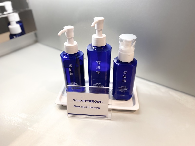 お手洗いに 雪肌精 が置いてある!フライト前に歯磨き・洗顔・スキンケアまでできて、これは本当にありがたい。 ええ、もちろん、遠慮なく使わせていただきました!